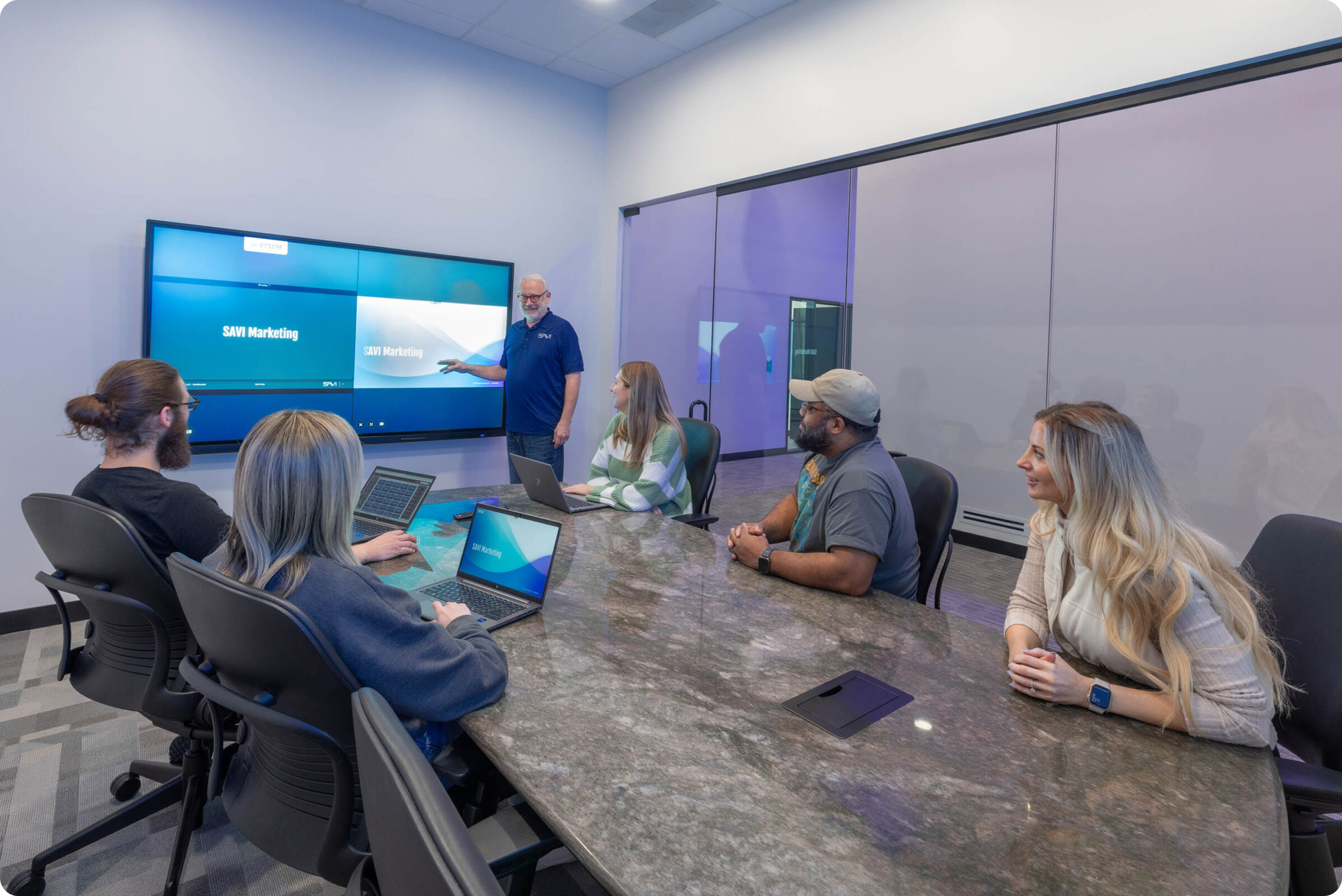 SAVI has installed multiple 98-, 86- and 75-inch LG CreateBoards to enhance training rooms, executive offices, huddle spaces, meeting rooms and combined bullpens. The boardroom houses a 65-inch model, enabling all employees and visitors to enjoy consistently excellent meeting experiences no matter who the host is or which room they meet in.