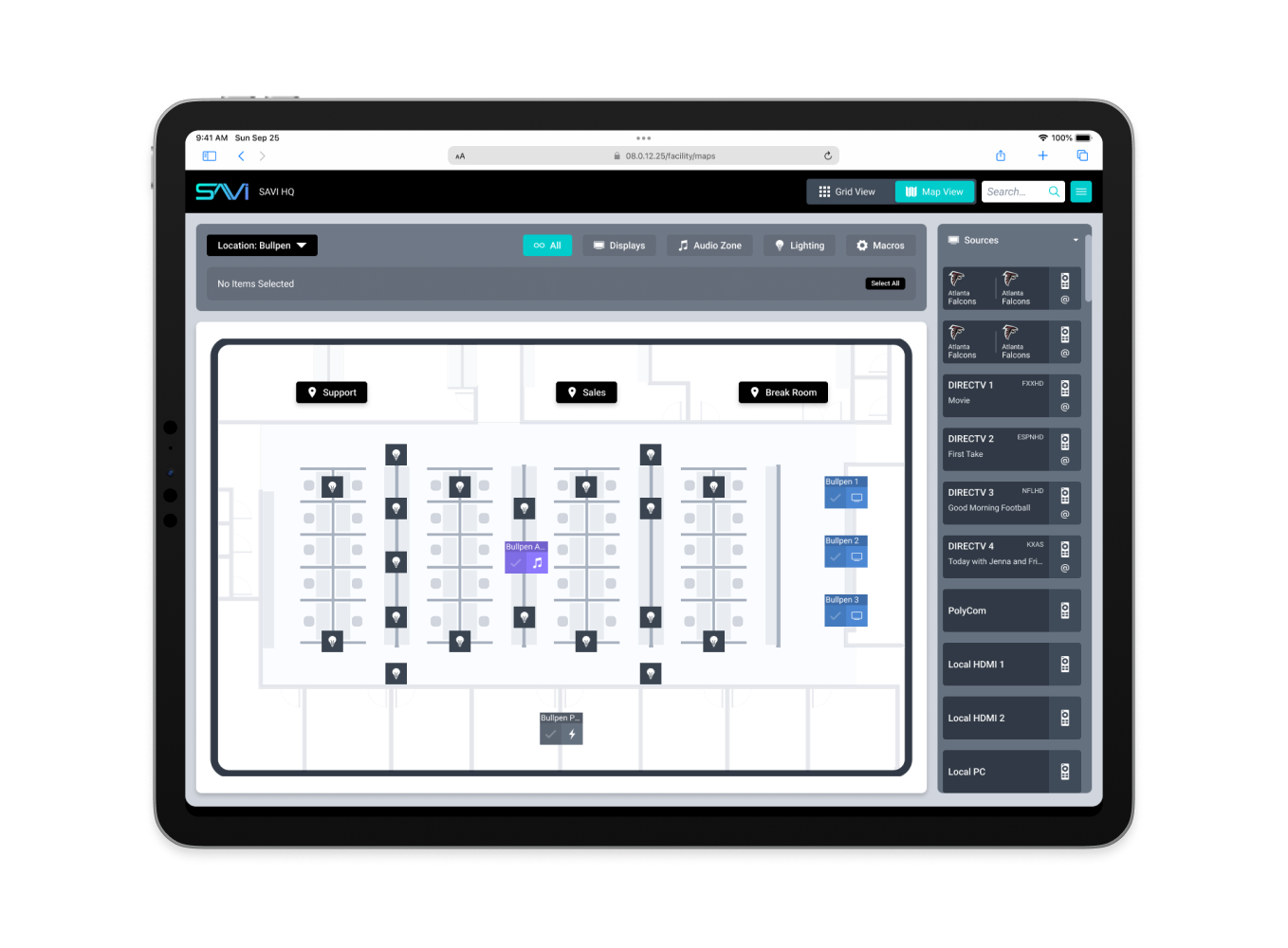 A visual layout of your restaurant that gives you real-time control and feedback of TVs, audio zones, lighting and more.